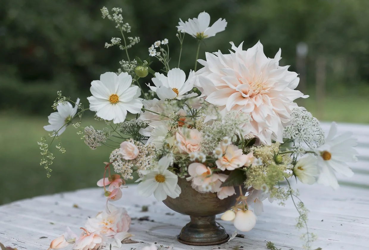 Nyt blogissa tehdään ihana kukka-asetelma puutarhan- ja luonnonkukista. Pääosassa daalia Cafe au Lait.