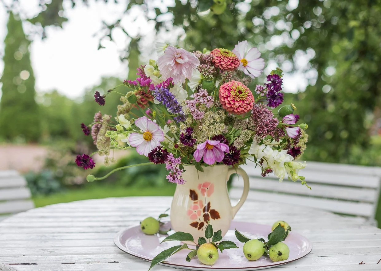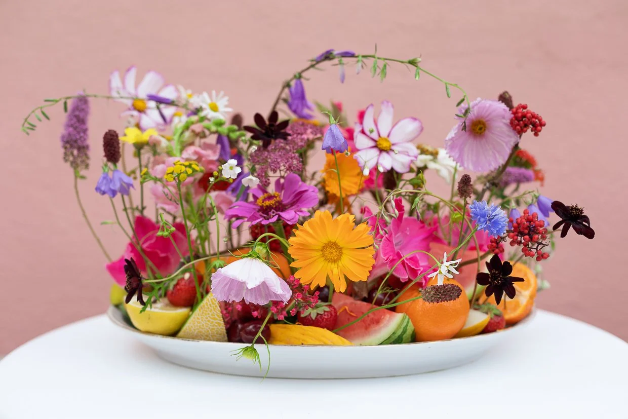 Kukkablogissa tehdään ihana ja kesäinen kukka-asetelma kukista ja hedelmistä!