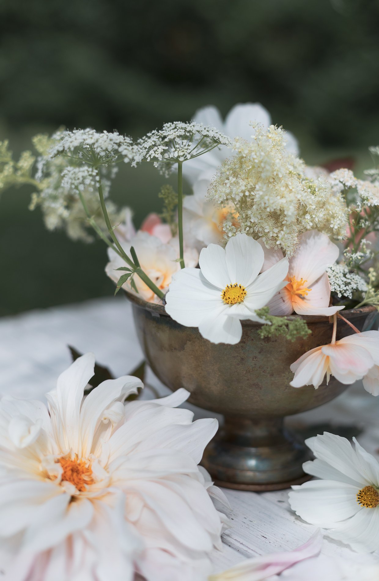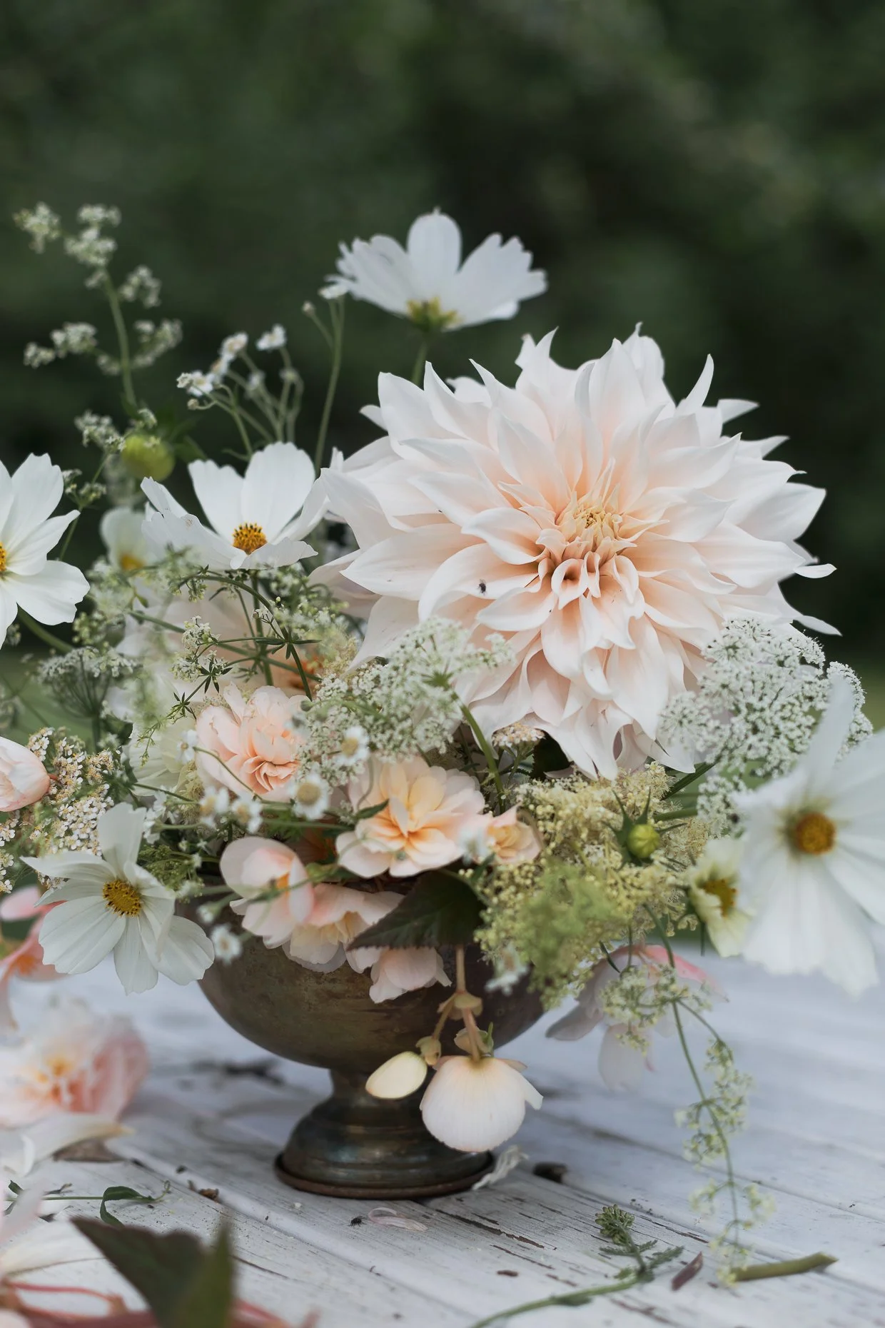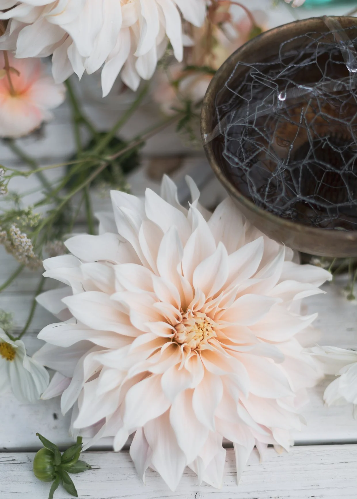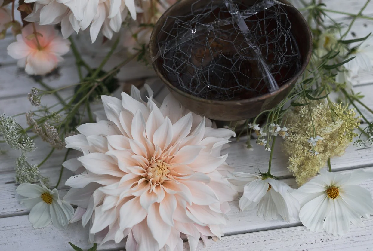 Kukat asettelen ihan mieleni mukaan, mutta haluan daalioiden olevan pääosassa tässä asetelmassa. Haluan asetelmani olevan vähän villi, muodoltaan orgaaninen hömpsäys.