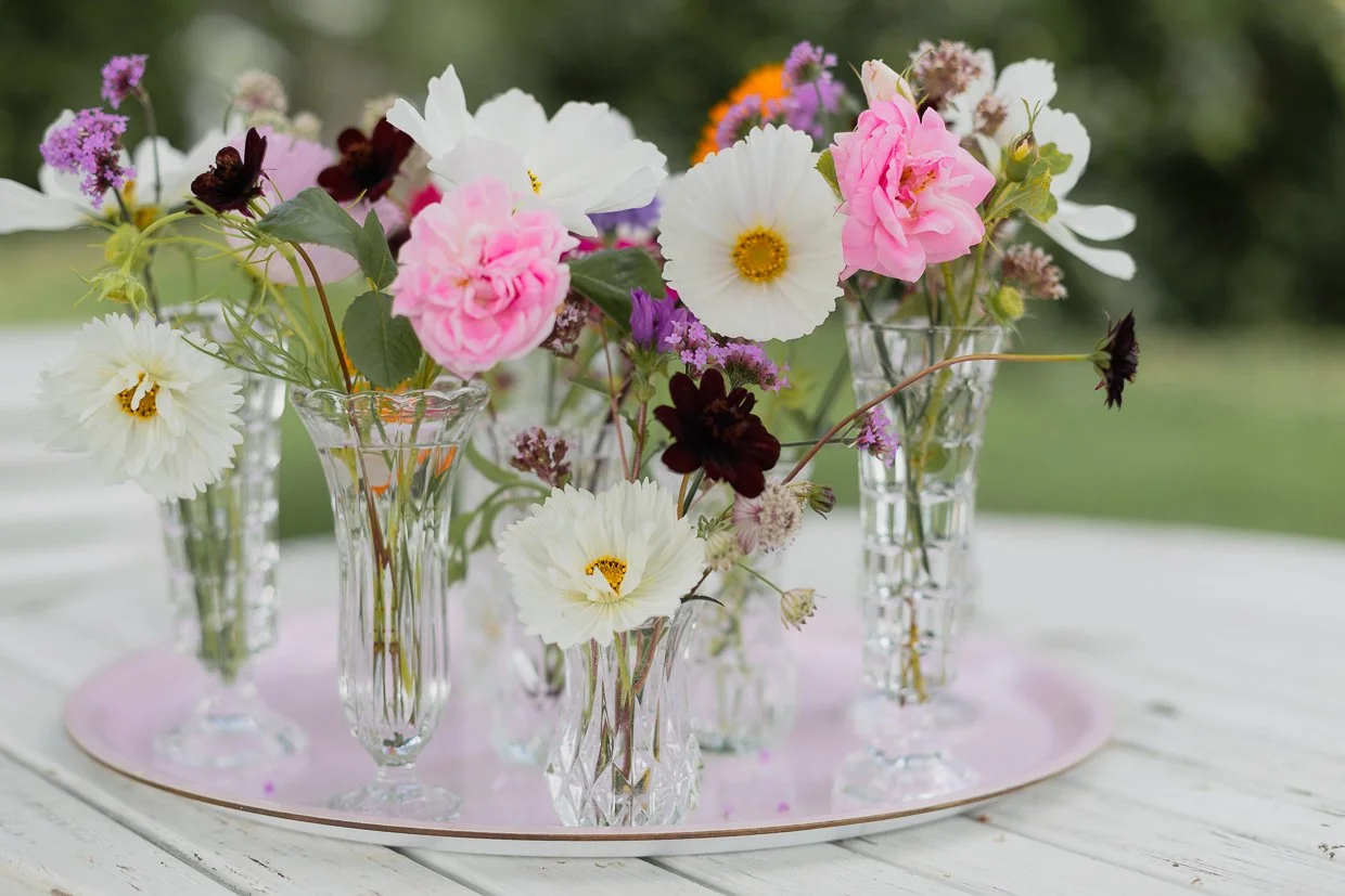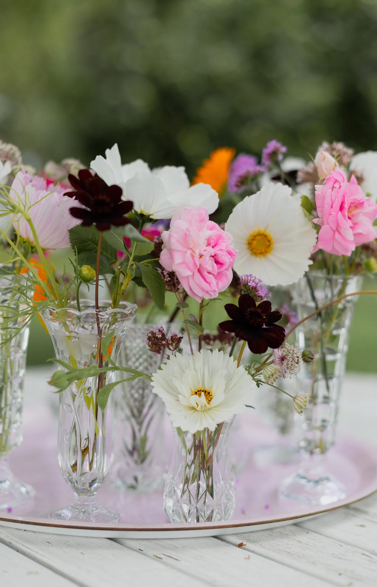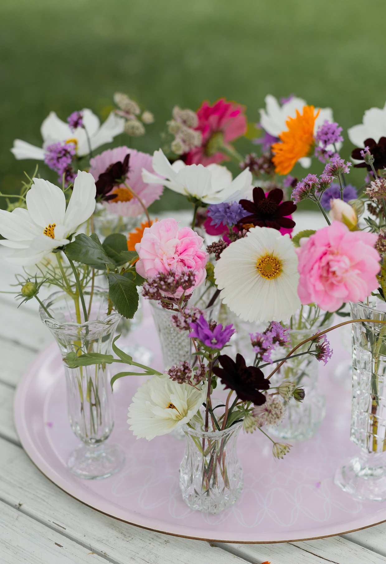 Minä kokosin kymmenkunta maljakkoa yhteen ja leikkelin puutarhastani kukat niihin. Mielestäni tästä tuli ihana kesäinen ja kukkaisa kokonaisuus.